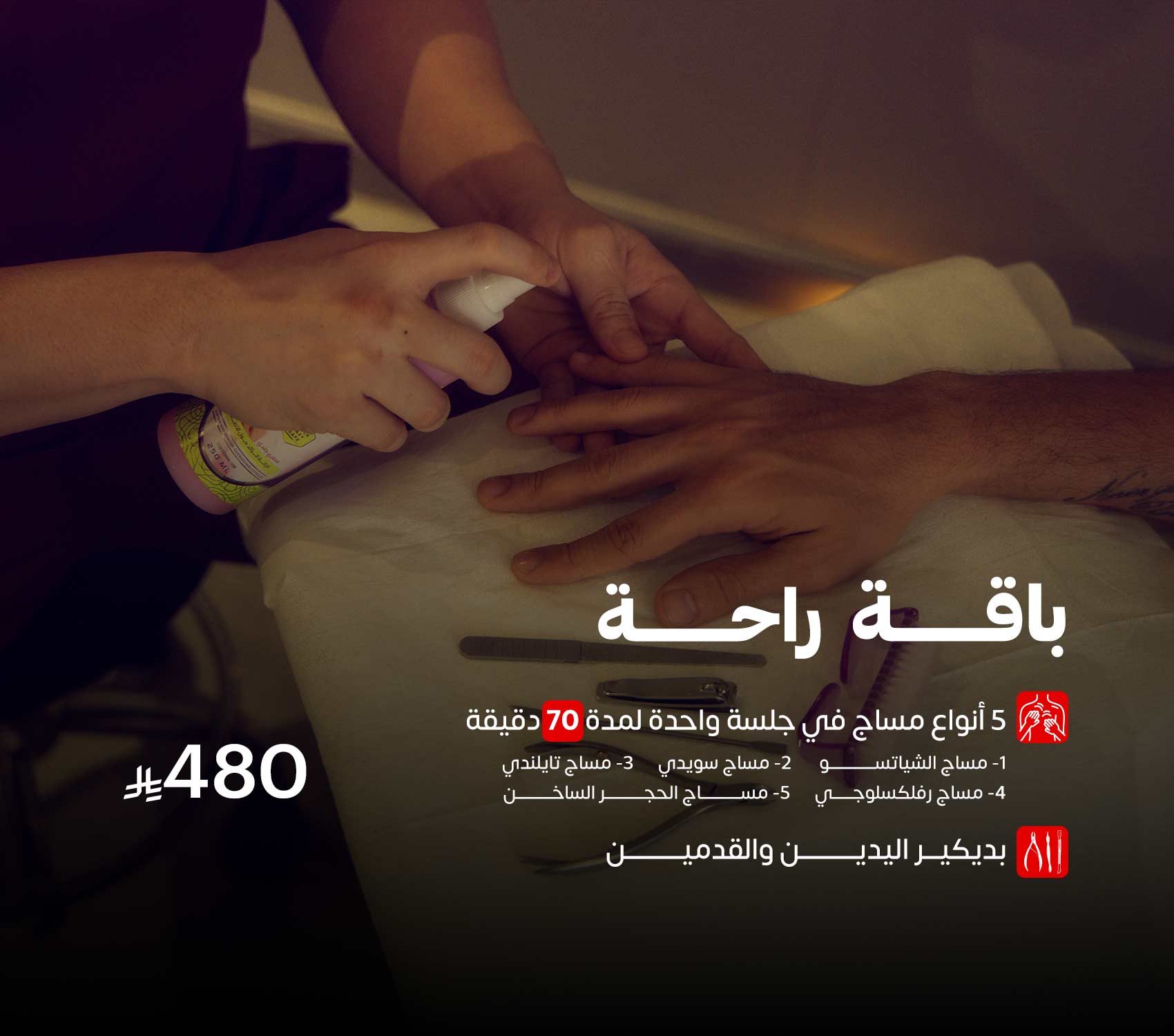 تشمل الباقة: خمسة أنواع من المساج تستهدف نقاط التوتر المختلفة في الجسم، لتعمل على تنشيط الدورة الدموية والتخلص من آثار الإجهاد البدني والذهني.