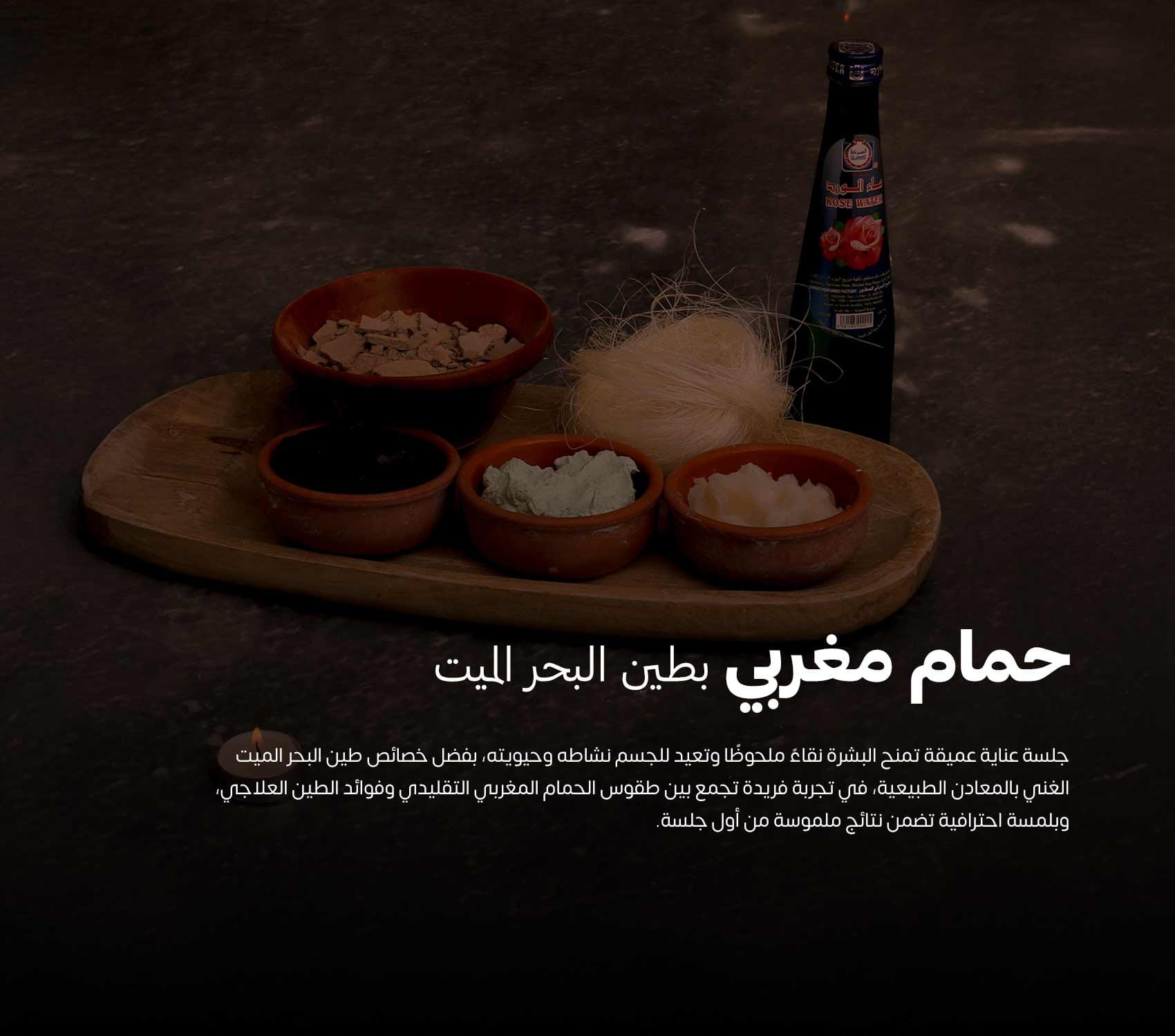 جلسة عناية عميقة تمنح البشرة نقاءً ملحوظًا وتعيد للجسم نشاطه وحيويته، بفضل خصائص طين البحر الميت الغني بالمعادن الطبيعية، في تجربة فريدة تجمع بين طقوس الحمام المغربي التقليدي وفوائد الطين العلاجي، وبلمسة احترافية تضمن نتائج ملموسة من أول جلسة.